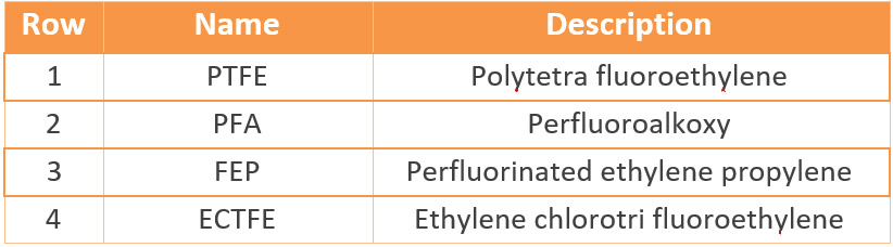 Fluoropolymers are available in various types, which are referenced in the table below. Due to the differing properties and behavior of these polymers, their selection for lining applications must be carried out by relevant specialists based on the operating chemical conditions as well as the type of equipment.